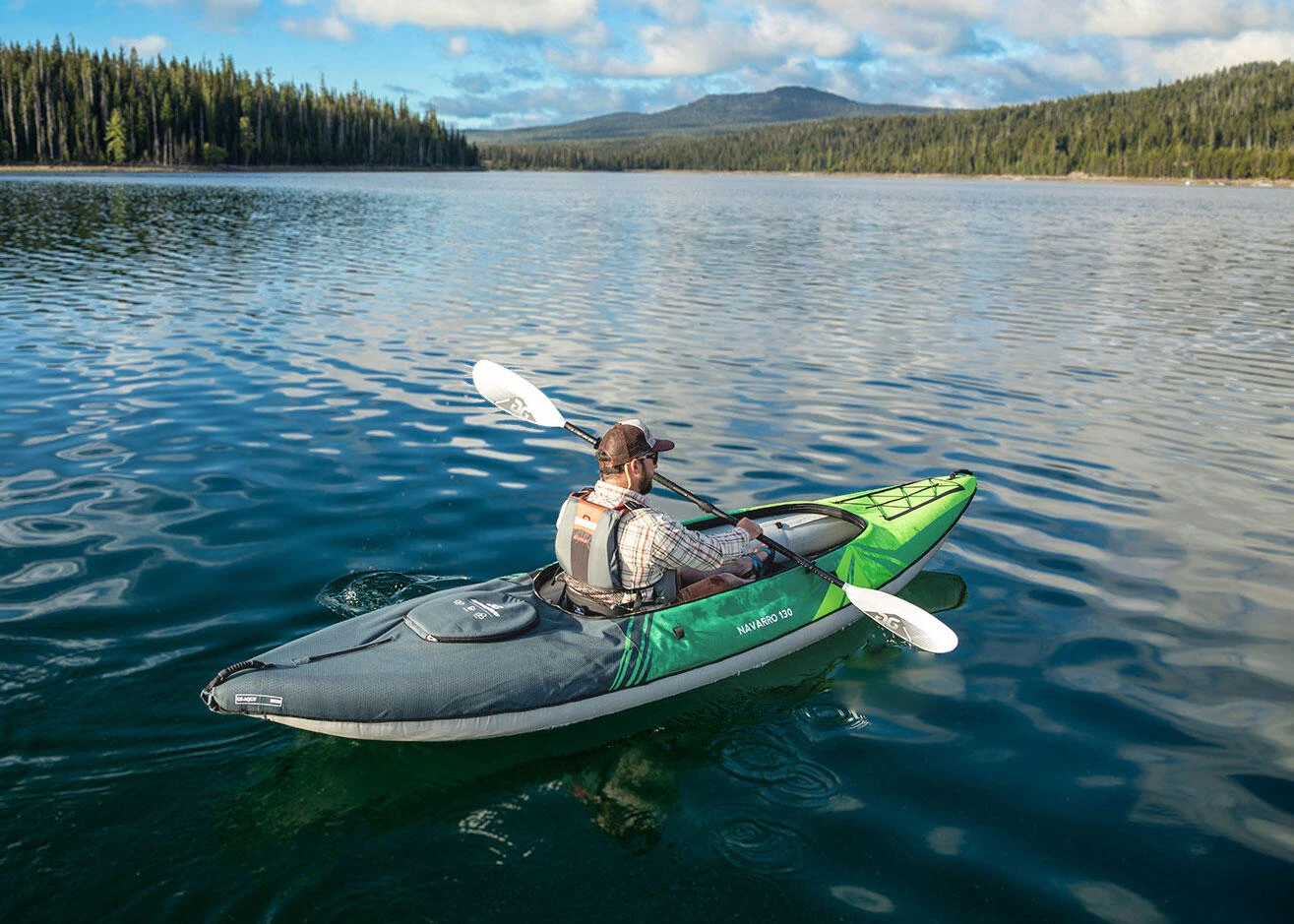 Introducing the Navarro 130 Inflatable Kayak from Aquaglide. The Navarro 130 is perfect for recreational touring that is built and design with stability and durability in mind offer user as intermediate cross-over touring boat to get you out on the waters in all-weather. The tight cockpit offers spray protection for you and all gear and complete with deck bungees upfront for securing dry bags, and what you see fit. The Navarro 130 is a spacious 1-person kayak, with cockpit drain, d-rings, paddle holders and even you get a quick-release fin. Longer than the Navarro 110, this 130 version suits the taller user, or for those who seek extra space and comfort; ideal should you be bringing your dog with you, to keep you company on your adventure.
