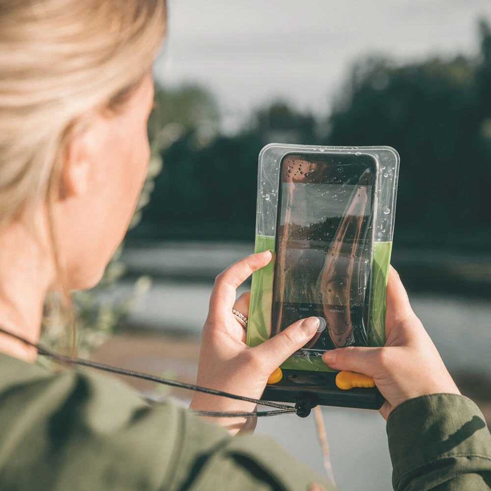 100% Waterproof – trusted since 1983. Talk and hear as normal. Great photos and videos. Touchscreens will work normally. Protection against water, dust, corrosion, sand and mud. Lanyard included. The classic AQUACLIP® seal protects and secures your phone from the elements. The seams are welded together with high-frequency radio waves, creating a super-strong bond. Functional in extreme conditions, desert or arctic conditions. Fingerprint Recognition (e.g. Touch ID) won’t work through the Aquapac – you will have to enter your passcode. Face Recognition (e.g. FaceID) software will work as normal in this Aquapac. Some phones have rather sharp edges. We recommend the use of a thin bumper case which will protect both phone and case.