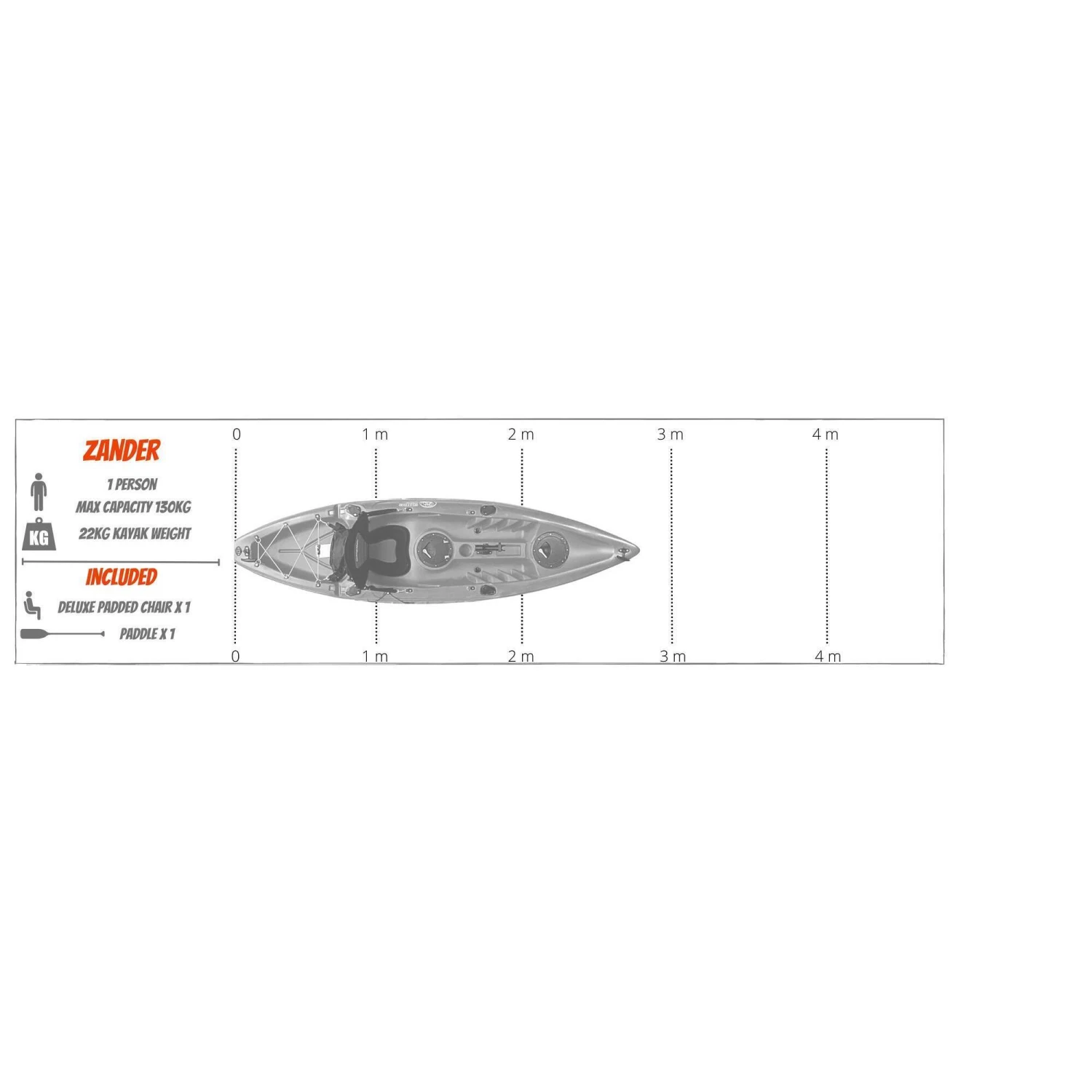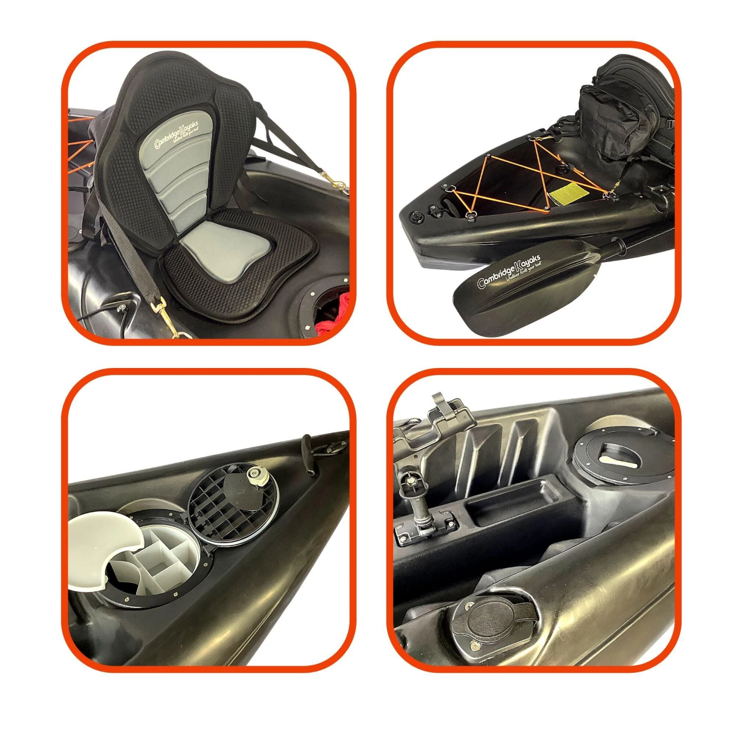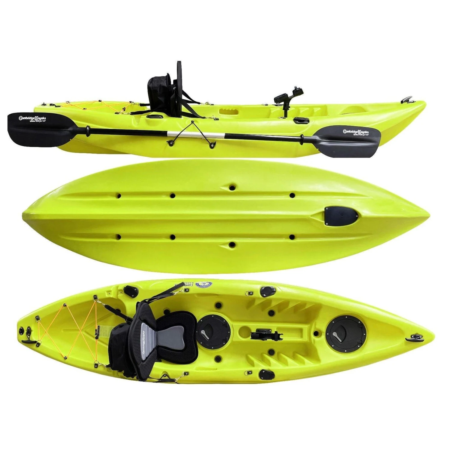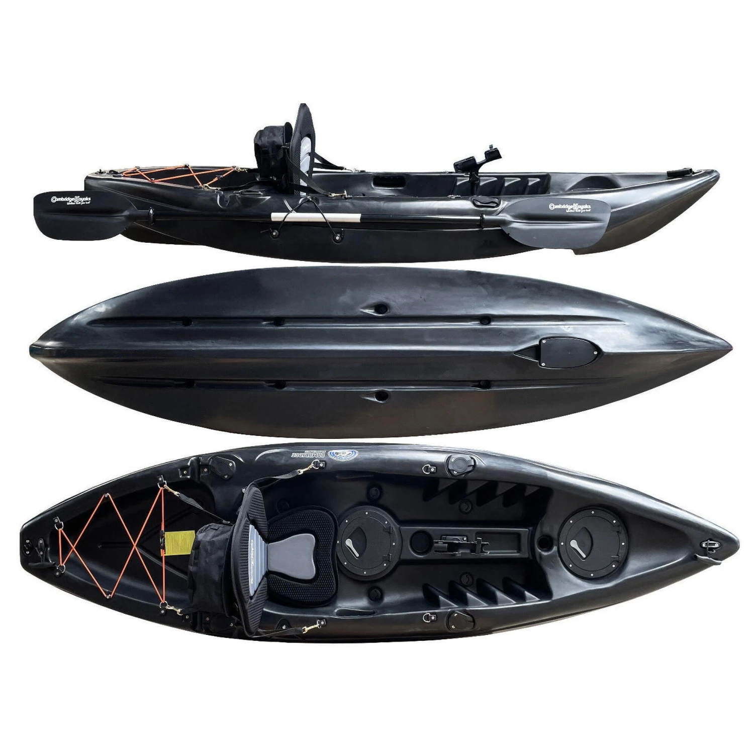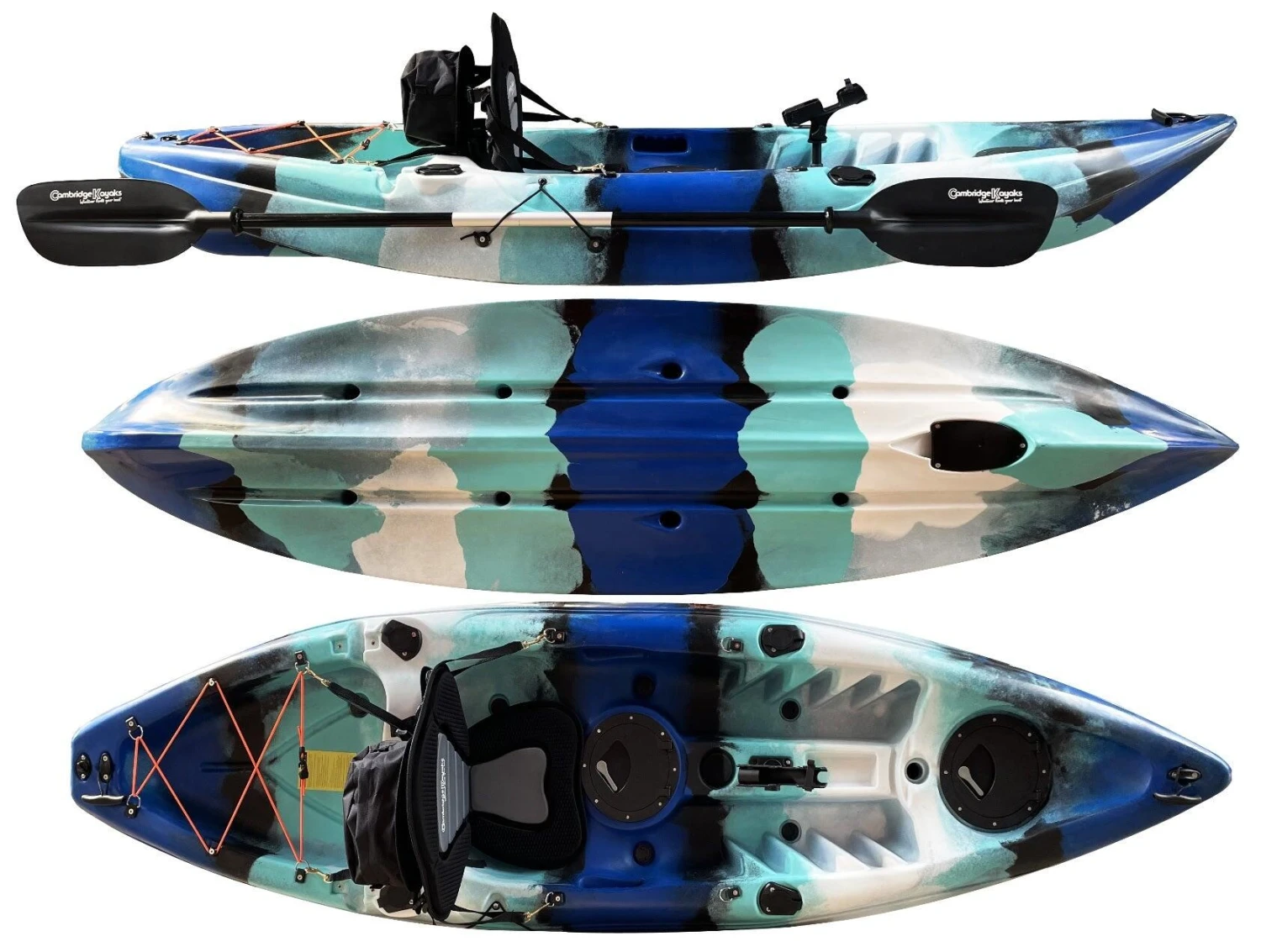 Zander single fishing kayak from Cambridge Kayaks. The Zander kayak is suitable for all ages, abilities, and fun for the family with its multi-channel predictable fat robust hull for stability and performance. Suitable for fishing, this kayak is stable and versatile, and ideal for a dedicated angler. This kayak is suitable for all ages, abilities, and fun for the family with its multi-channel predictable wide robust hull for stability and performance. Made with LLDPE the best material available for impact resistance and durability, and UV resistance, Roto spun moulded so no joins. Complete with, 1 x lightweight pro paddle, which are two-part for easy storage.1 x luxury padded back seat. Drinks holder space moulded into the deck. 2 x large 28cm water-resistant flip hatches, both have a dry bag lining. (for your wallet, keys, phone) Large storage behind the rear seat with a cargo net for your rucksack or picnic. 4 x side fishing rod holders. Centre pro fishing rod holder. Scupper plugs, six locations, for bailing water. Handles front and back, handles on each side with straps for paddle park storage. (cheaper kayaks don’t have this) Moulded ribbed footrest for comfort when seated.