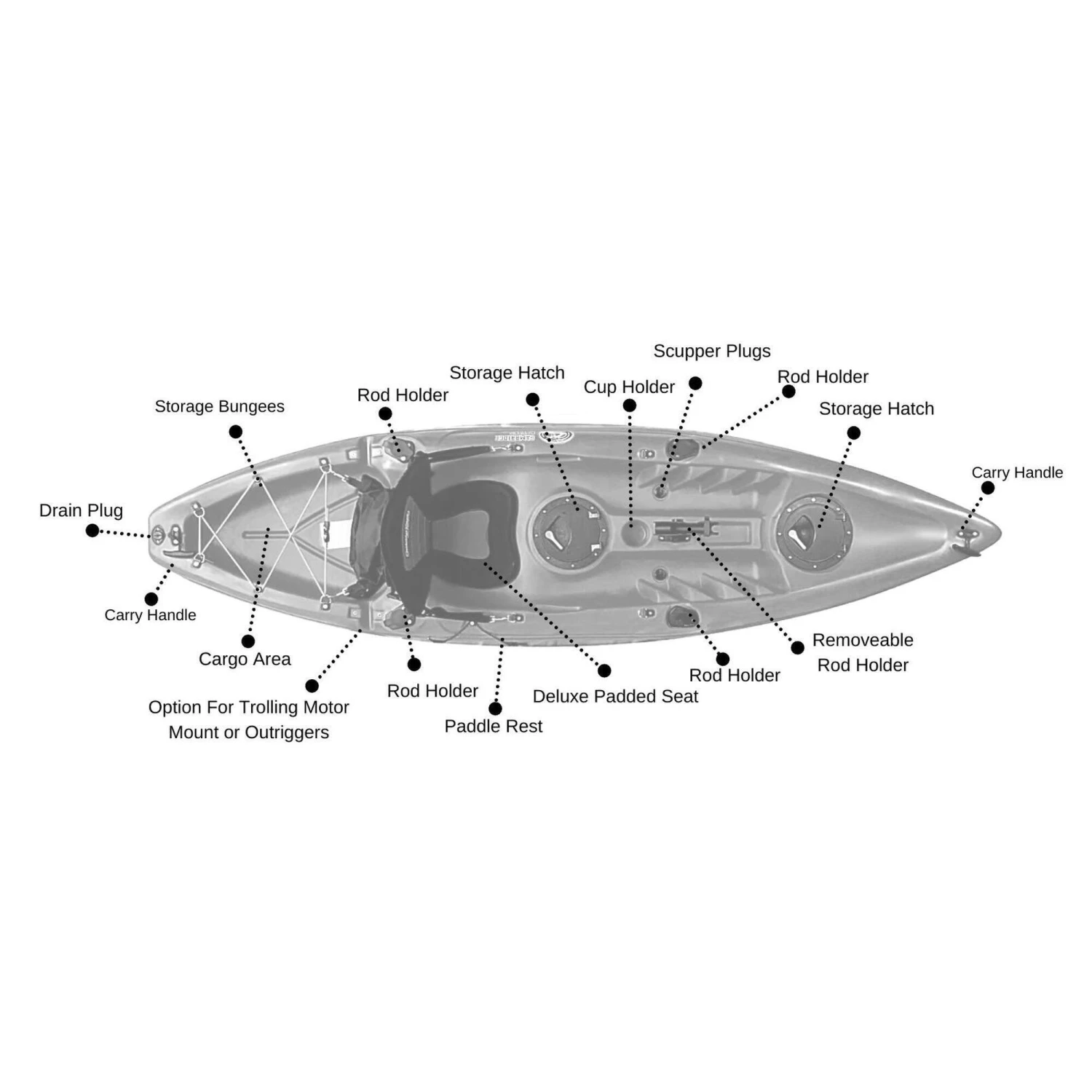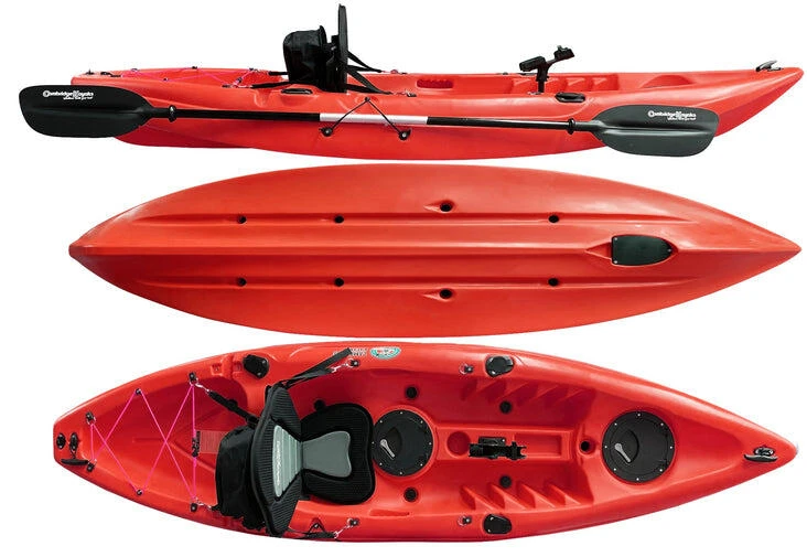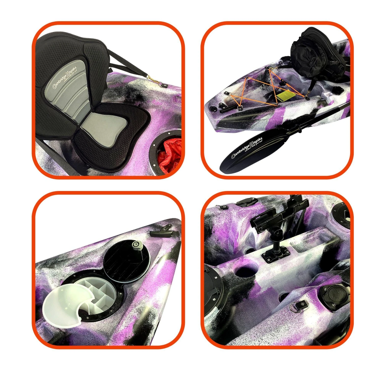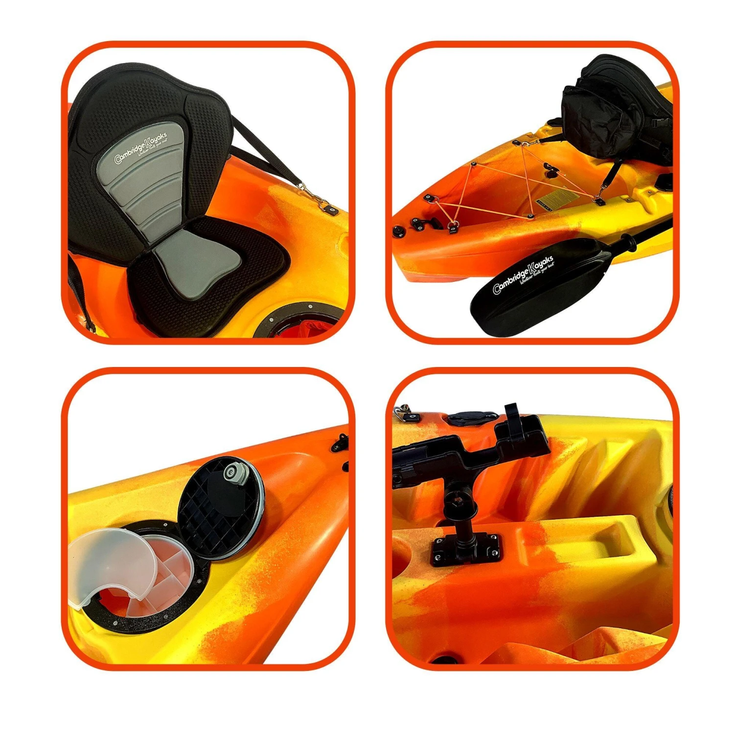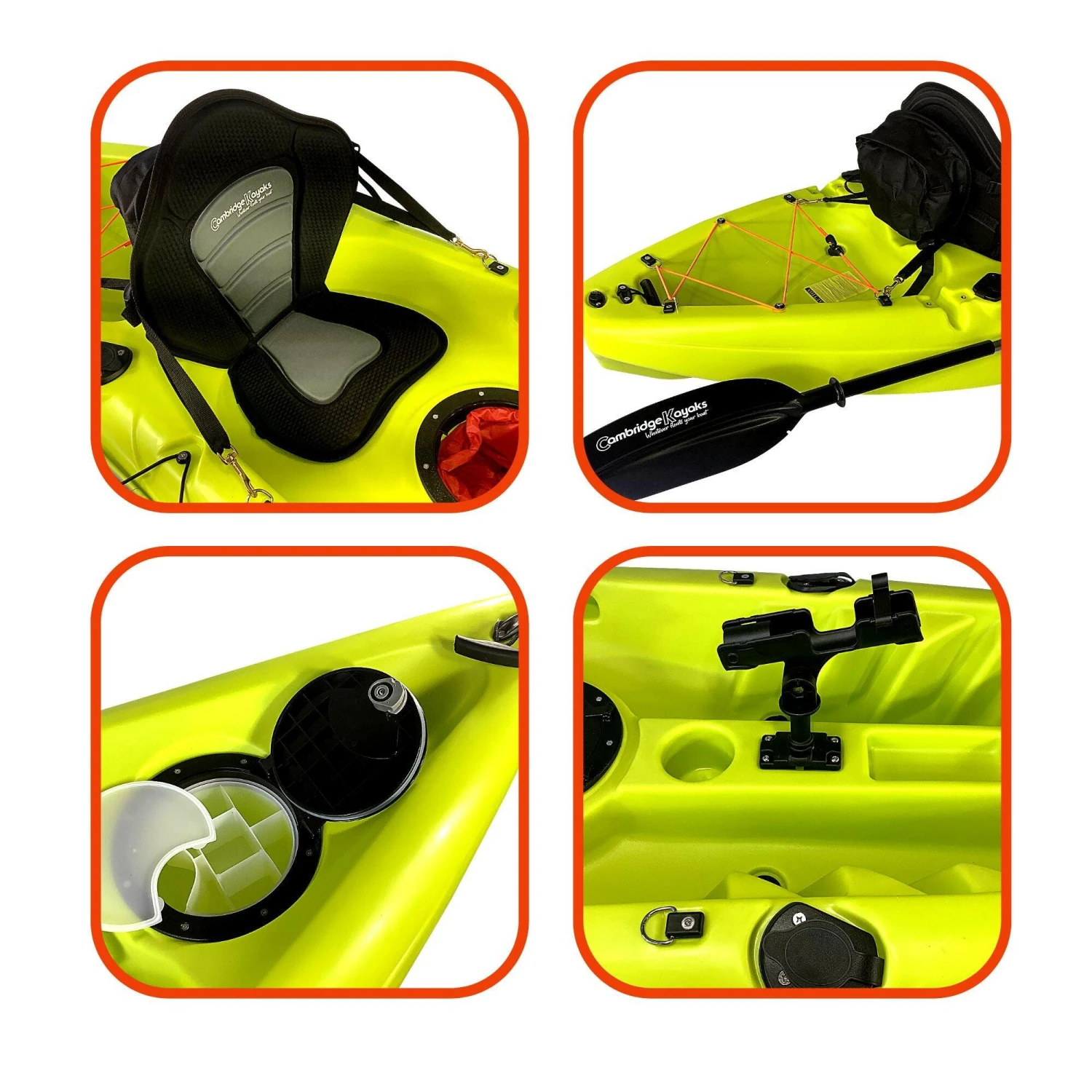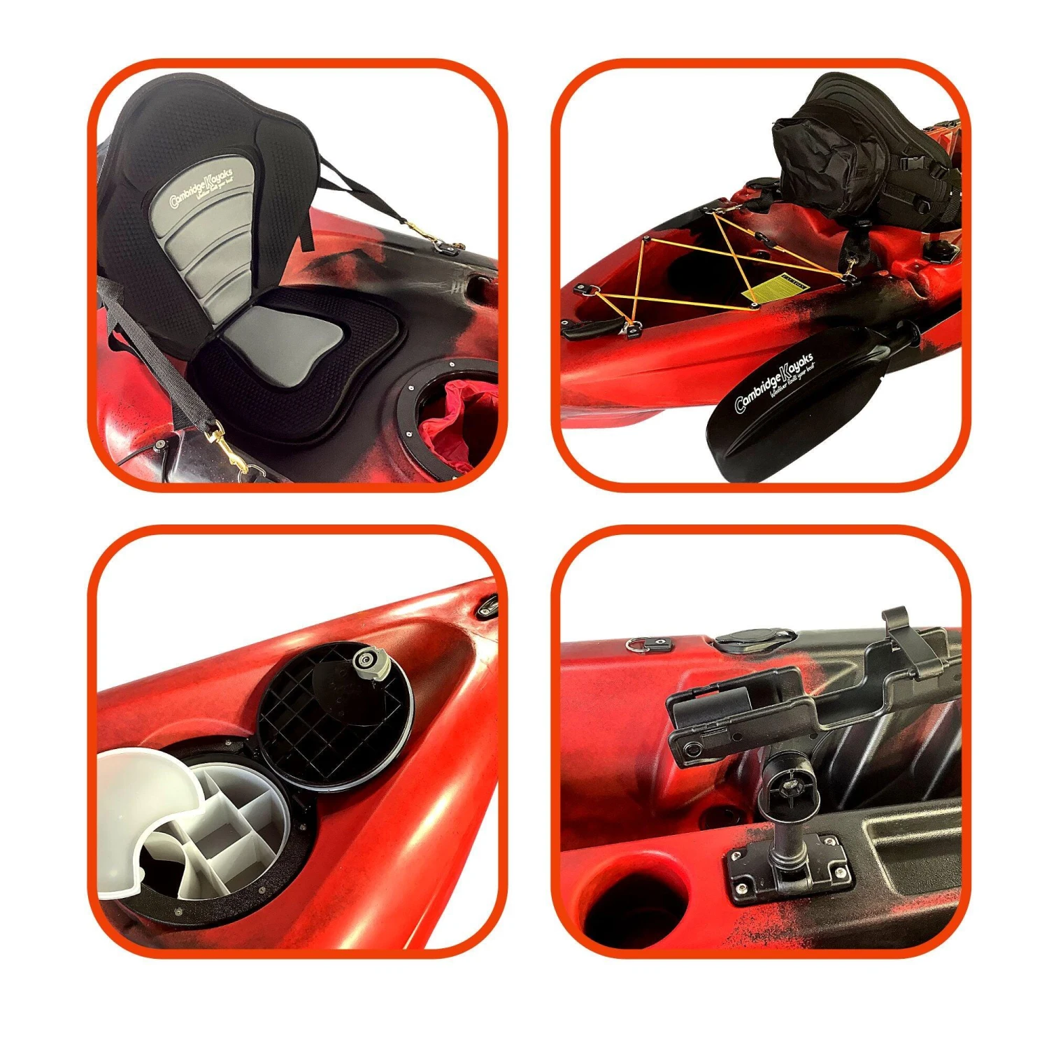 Zander single fishing kayak from Cambridge Kayaks. The Zander kayak is suitable for all ages, abilities, and fun for the family with its multi-channel predictable fat robust hull for stability and performance. Suitable for fishing, this kayak is stable and versatile, and ideal for a dedicated angler. This kayak is suitable for all ages, abilities, and fun for the family with its multi-channel predictable wide robust hull for stability and performance. Made with LLDPE the best material available for impact resistance and durability, and UV resistance, Roto spun moulded so no joins. Complete with, 1 x lightweight pro paddle, which are two-part for easy storage.1 x luxury padded back seat. Drinks holder space moulded into the deck. 2 x large 28cm water-resistant flip hatches, both have a dry bag lining. (for your wallet, keys, phone) Large storage behind the rear seat with a cargo net for your rucksack or picnic. 4 x side fishing rod holders. Centre pro fishing rod holder. Scupper plugs, six locations, for bailing water. Handles front and back, handles on each side with straps for paddle park storage. (cheaper kayaks don’t have this) Moulded ribbed footrest for comfort when seated.