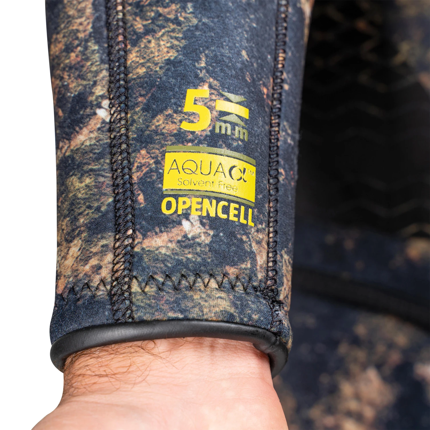 The khaki camo (diving suit reference 8501841) is “realistic”. Its almost photographic print allows the diver to blend in with their environment against rock, seagrass, seaweed, etc.