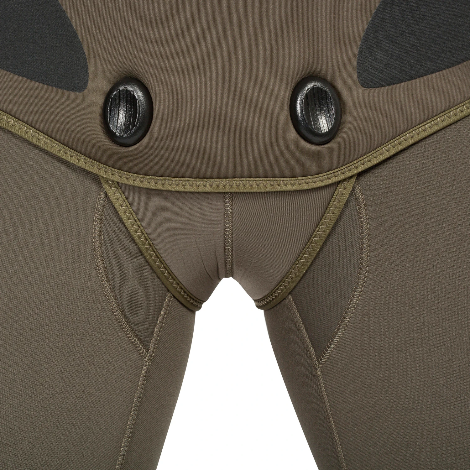 This spearfishing jacket has a double-clip crotch fastener (beaver tail with double clip).